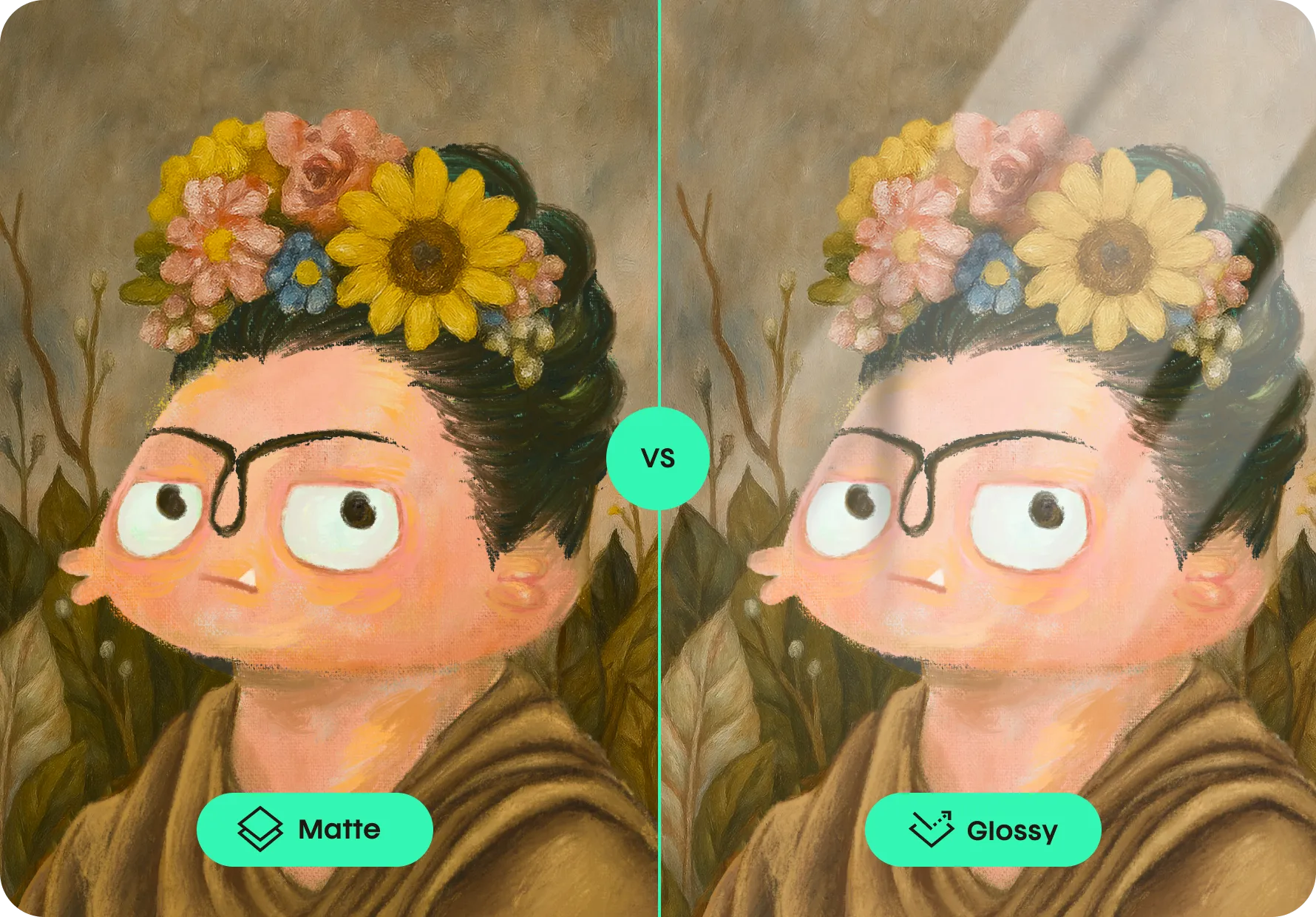 Lighting ConditionOur matte canvas ensures a crystal-clear display in any environment by eliminating reflections and glare. Whether under natural light or spotlights, every detail of your artwork remains vibrant and visible without distraction. Perfect for galleries, homes, or studios.